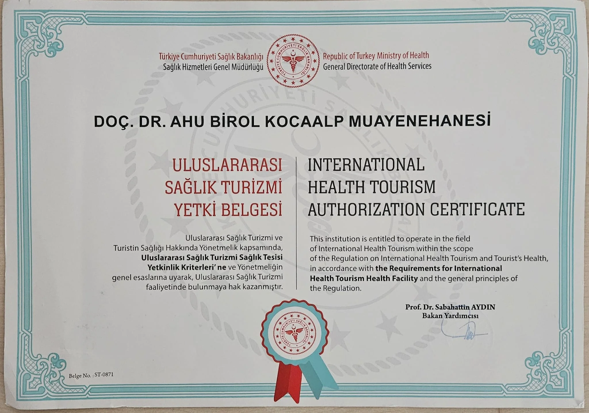 T.C. Sağlık Bakanlığı tarafından verilen Uluslararası Sağlık Turizmi Yetki Belgesine sahip olup, sağlık turizmi kapsamında uluslararası hastalara hizmet verme yetkilidir.